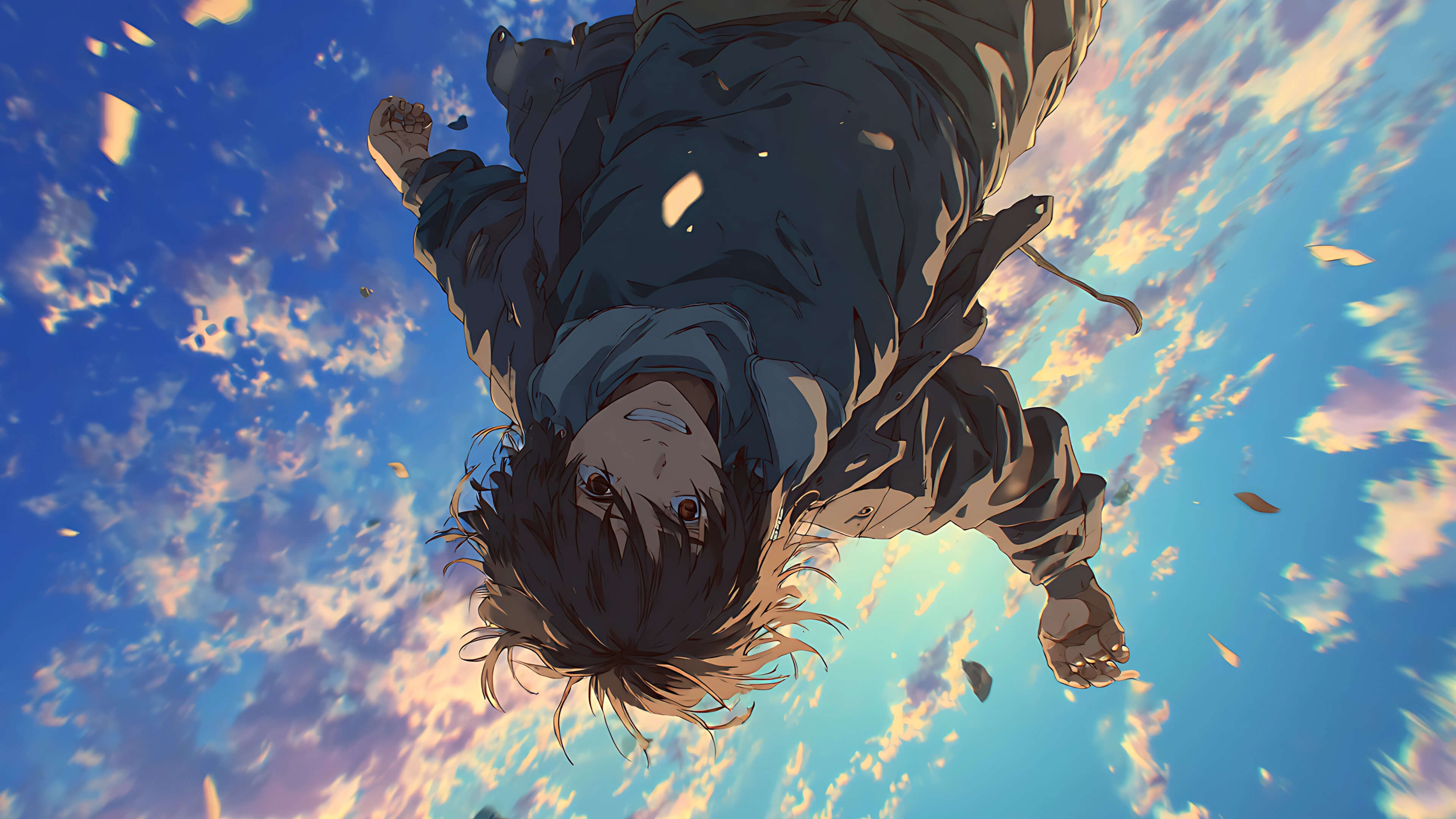 anime sky art, falling anime character, cinematic anime illustration, emotional anime art, letting go, freedom symbolism, dreamlike clouds, anime aesthetic, introspective artwork, sky falling scene, transformation, peaceful chaos
