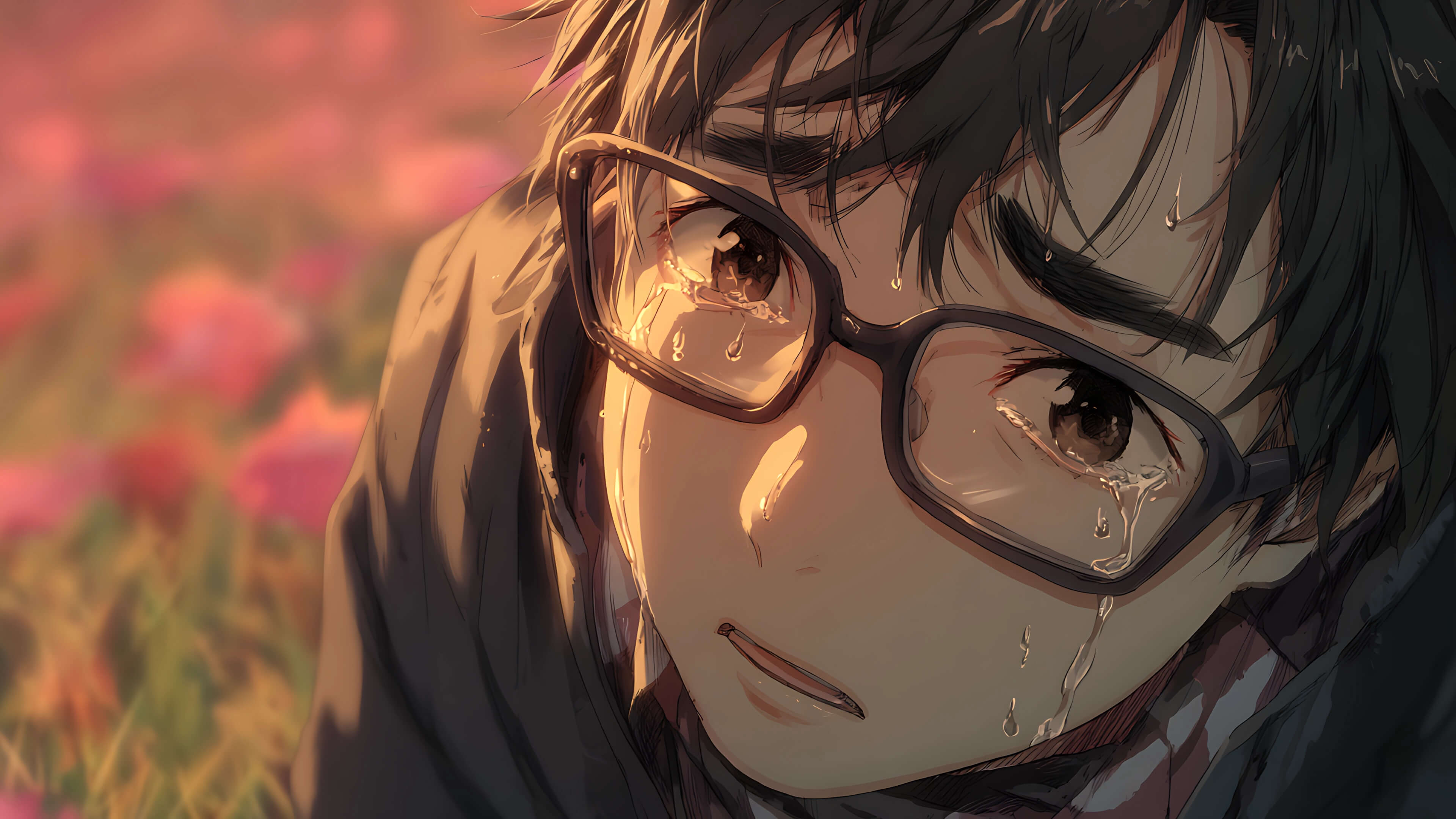 Anime-style illustration of a young man wearing glasses crying with tears streaming down his face, expressing heartbreak and emotional vulnerability.