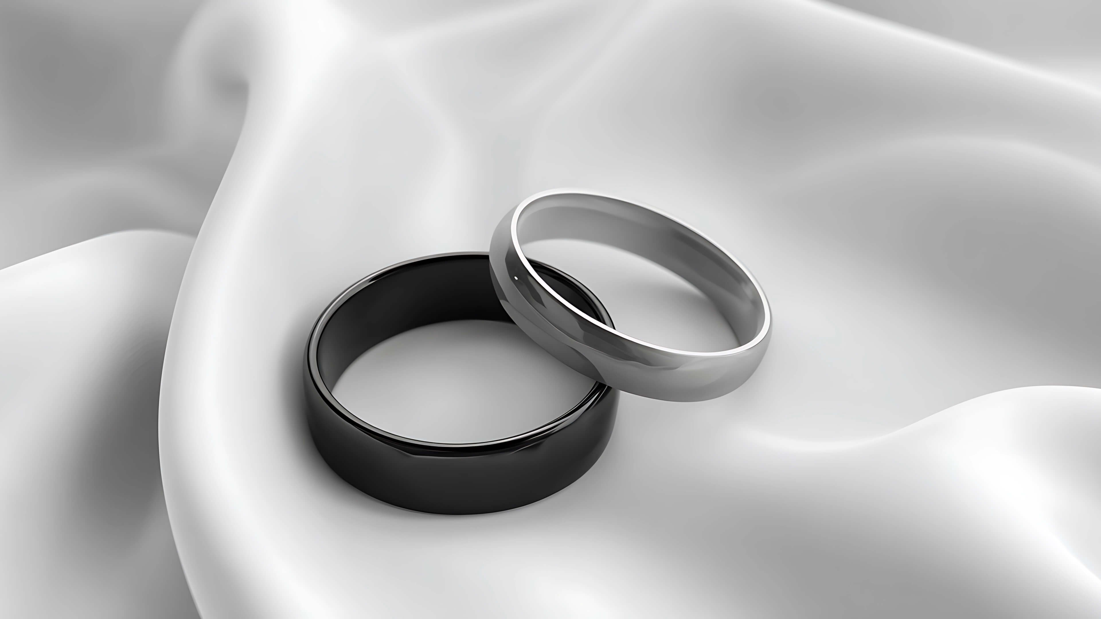 A minimalist illustration featuring two smooth rings-one black and one silver-resting together on flowing white fabric. The soft lighting, reflective surfaces, and monochrome contrast symbolize unity, balance, and timeless connection. The composition feels modern, refined, and emotionally subtle, making it ideal for themes of love, commitment, and contrast.